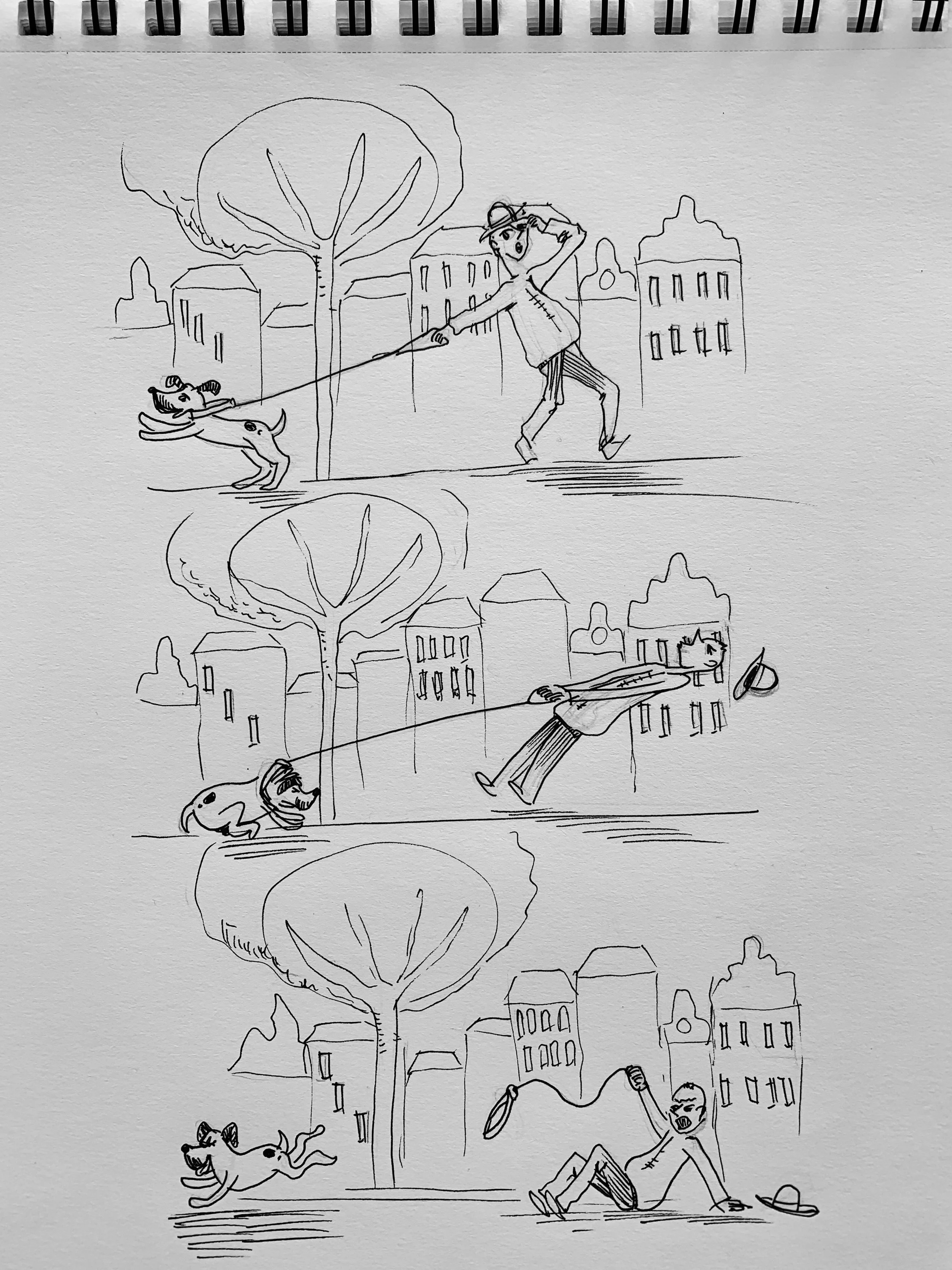 Create a sequential illustration that shows a humorous situation that most people can relate to.